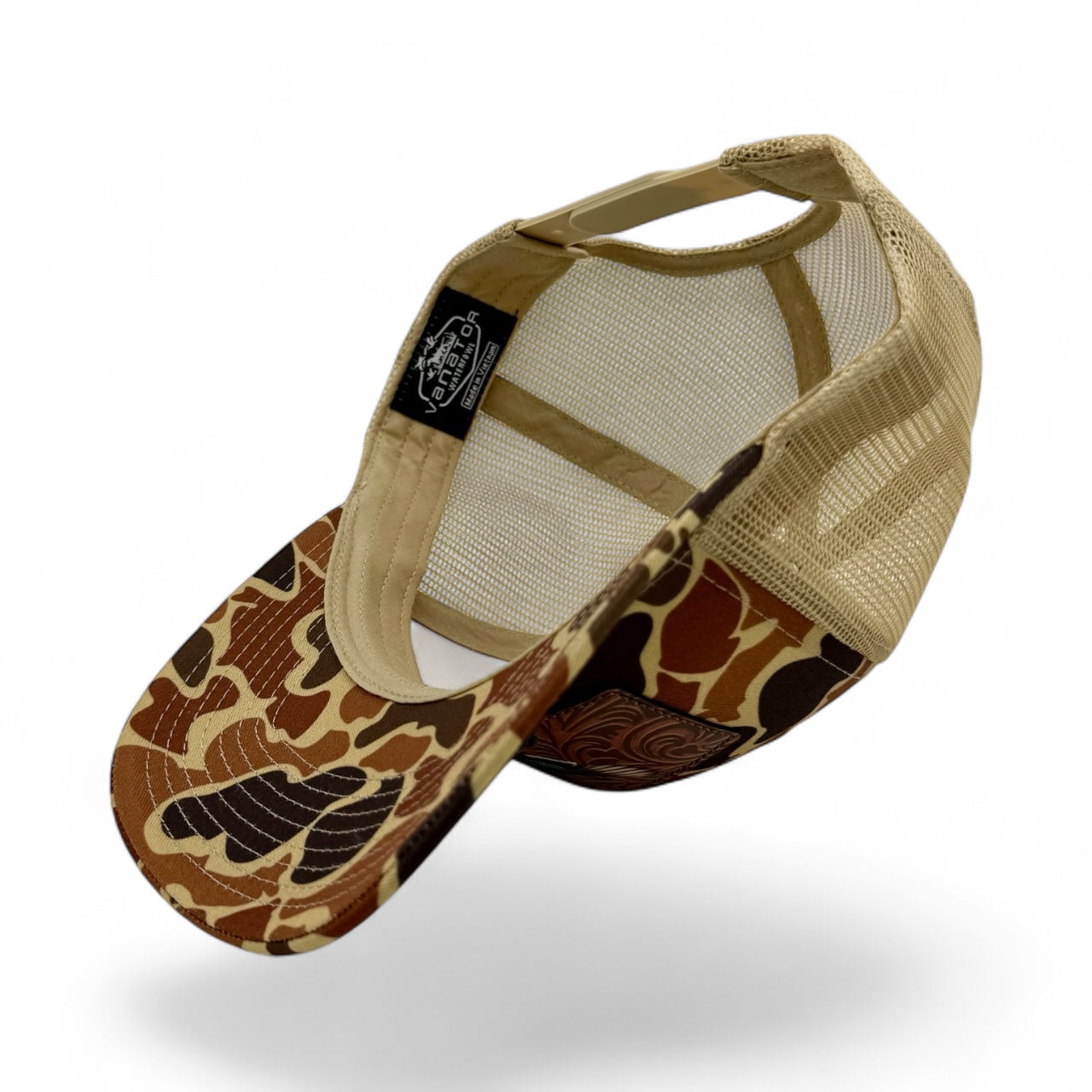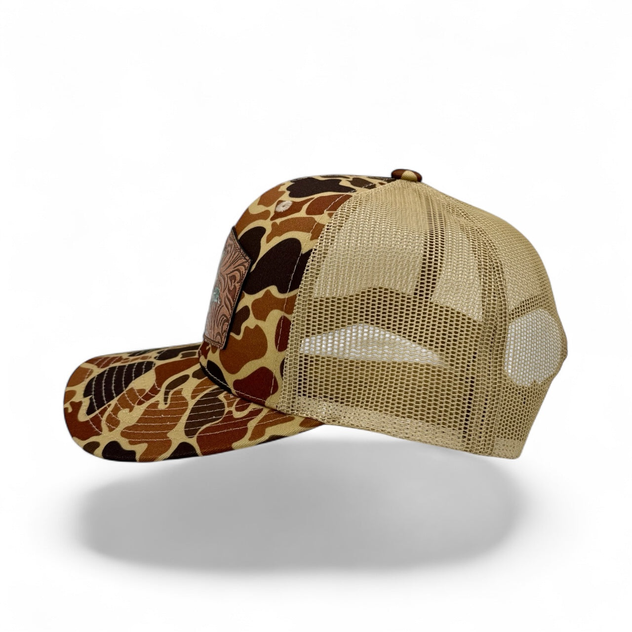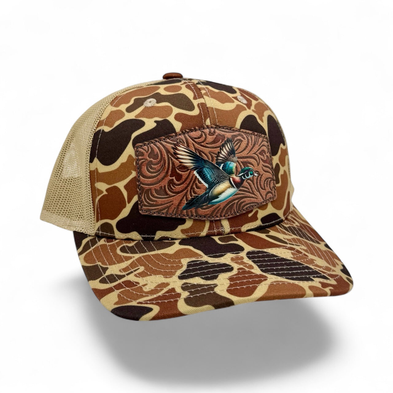 A nod to tradition and craftsmanship. The Heritage Tooled Wood Duck blends old-school duck camo with a hand-tooled leather patch featuring a detailed wood duck in flight. Built on a breathable meshback for all-day comfort, this cap carries that rugged, timeless look straight from the blind to town.